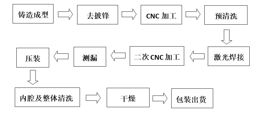 從上述加工流程中可以看出,各工序及二次加工過程中對內(nèi)腔產(chǎn)生大量油污、鋁屑、粉塵會(huì)沉積在型腔中,不通過有效的清洗會(huì)造成水路運(yùn)行過程型腔中臟物顆粒進(jìn)入水路系統(tǒng),對水路系統(tǒng)造成致命破壞。